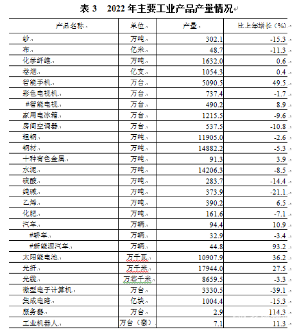 先进制造业增势良好。规模以上工业中,高技术、装备制造业增加值比上年分别增长10.8%、8.5%,对规上工业增加值增长贡献率分别为48.6%、85.2%,占规上工业比重为24.0%、52.6%,比上年均提高1.5个百分点。分行业看,电子、医药、汽车、电气、专用设备等先进制造业增加值分别增长6.3%、11.0%、14.8%、16.3%和6.0%。新能源、新型材料、新一代信息技术相关产品产量较快增长,其中新能源汽车、锂离子电池、太阳能电池、工业机器人、碳纤维及其复合材料、智能手机、服务器产量分别增长93.2%、23.4%、36.2%、11.3%、64.6%、49.5%和114.3%。