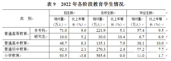 教育事业稳步推进。年末全省共有普通高等学校168所(含独立学院)。普通高等教育本专科招生数71.0万人,在校生数221.9万人,毕业生数57.4万人;研究生招生数10.0万人,在校生数30.0万人,毕业生数6.7万人。中等职业教育(不含技工学校)招生数23.5万人,在校生数67.3万人。特殊教育学校招生数0.3万人,在校生数2.0万人。全省共有幼儿园8143所,比上年增加27所;在园幼儿237.1万人,比上年减少15.4万人。