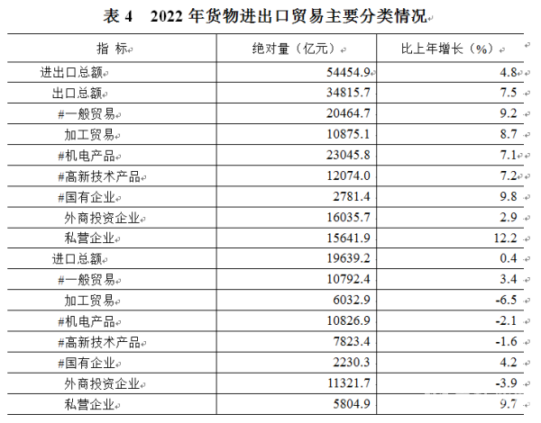 对外贸易稳中提质。全年进出口总额54454.9亿元,规模再创历史新高,比上年增长4.8%。其中,出口34815.7亿元,增长7.5%;进口19639.2亿元,增长0.4%。从贸易方式看,一般贸易进出口总额31257.1亿元,增长7.1%,占进出口总额比重为57.4%,比上年提升1.2个百分点。从出口主体看,私营企业、国有企业、外商投资企业出口额分别增长12.2%、9.8%、2.9%。从出口市场看,对欧盟、日本出口分别增长14.1%、4.2%,对印度、俄罗斯、东盟出口分别增长29.7%、4.2%和16.1%。从出口产品看,机电、高新技术产品出口额分别增长7.1%、7.2%。对“一带一路”沿线国家进出口14902.9亿元,增长13.1%,连续7年保持增长;占进出口总额比重为27.4%,比上年提升2.0个百分点。