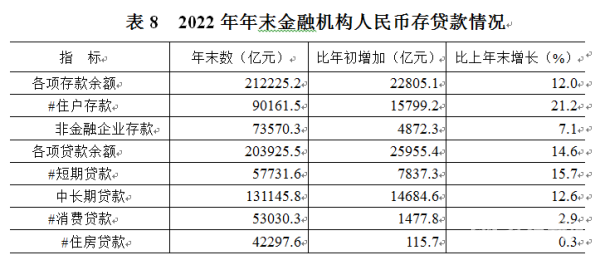 金融存贷款较快增长。年末全省金融机构人民币存款余额212225.2亿元,比上年末增长12.0%,比年初增加22805.1亿元。其中,住户存款增加15799.2亿元,非金融企业存款增加4872.3亿元。年末金融机构人民币贷款余额203925.5亿元,比上年末增长14.6%,比年初增加25955.4亿元。其中,中长期贷款增加14684.6亿元,短期贷款增加7837.3亿元。