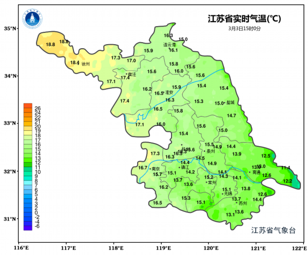 这两天的天气,则突出一个“暖”字,回暖的步伐势不可挡,咱江苏的温度也在持续上升,昨天15点,全省最高气温在18℃左右。