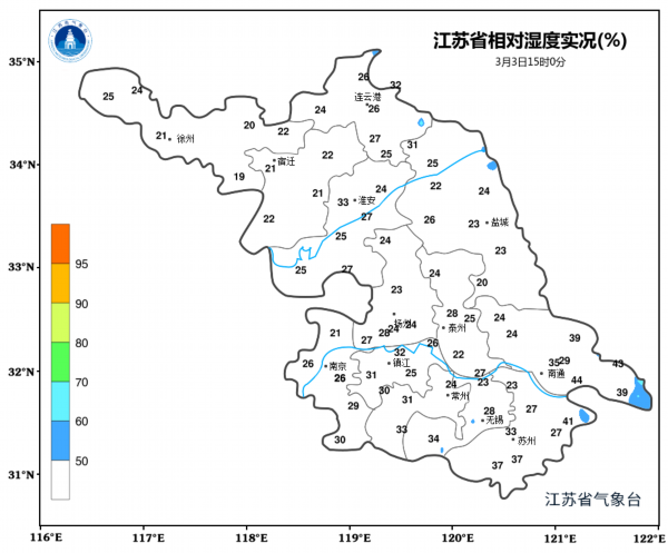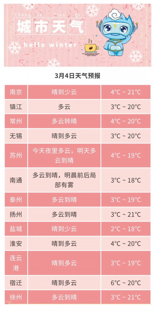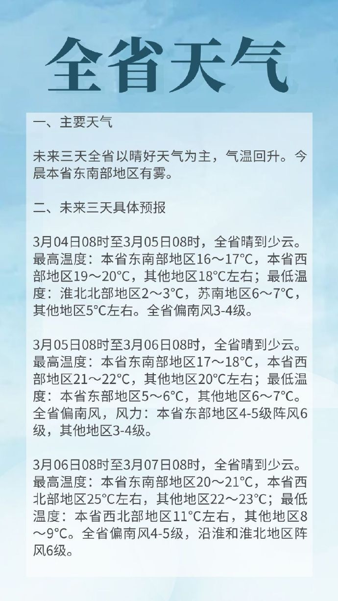 3月04日08时至3月05日08时,全省晴到少云。最高温度:本省东南部地区16~17℃,本省西部地区19~20℃,其他地区18℃左右;最低温度:淮北北部地区2~3℃,苏南地区6~7℃,其他地区5℃左右。全省偏南风3-4级。 需要提醒的是,今晨本省东南部地区有雾,请注意交通安全,谨慎慢行。