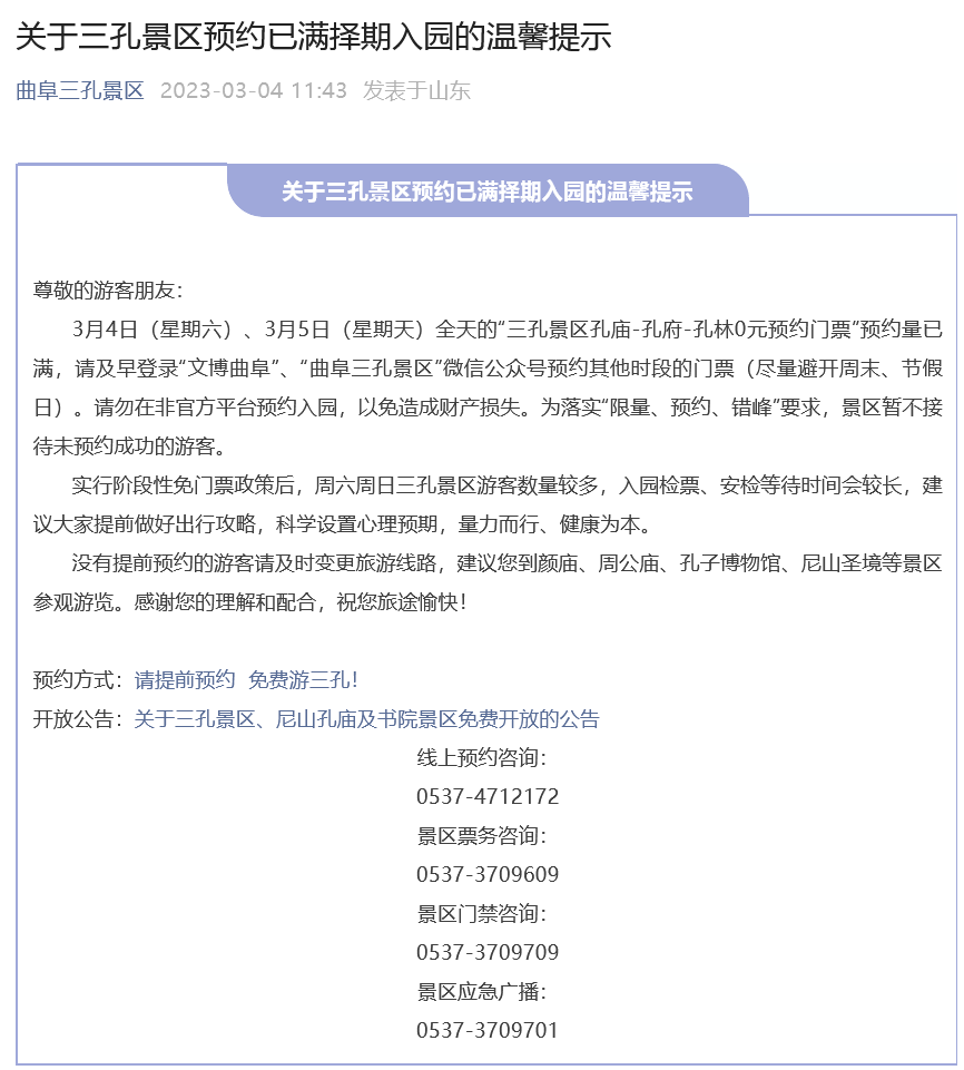 3月4日(星期六)、3月5日(星期天)全天的“三孔景区孔庙-孔府-孔林0元预约门票”预约量已满,请及早登录“文博曲阜”、“曲阜三孔景区”微信公众号预约其他时段的门票(尽量避开周末、节假日)。请勿在非官方平台预约入园,以免造成财产损失。为落实“限量、预约、错峰”要求,景区暂不接待未预约成功的游客。