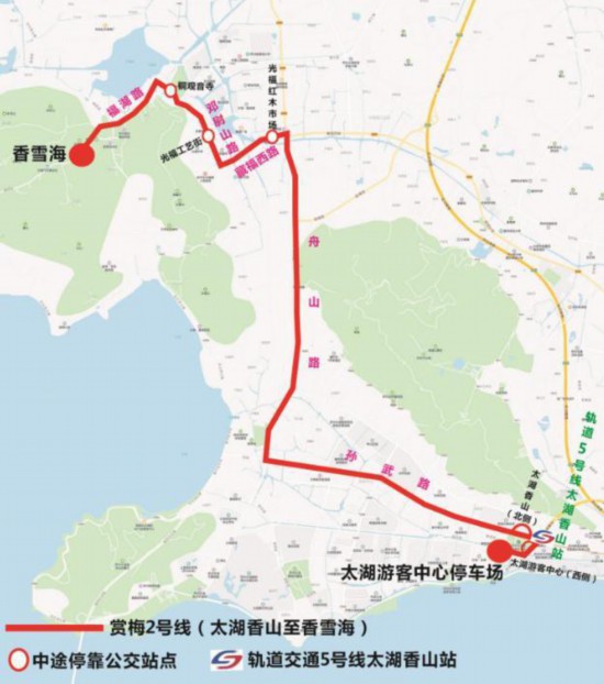 3、 停靠站点:太湖香山(北侧)、太湖游客中心(西侧)、光福红木市场、光福工艺街、铜观音寺、香雪海。