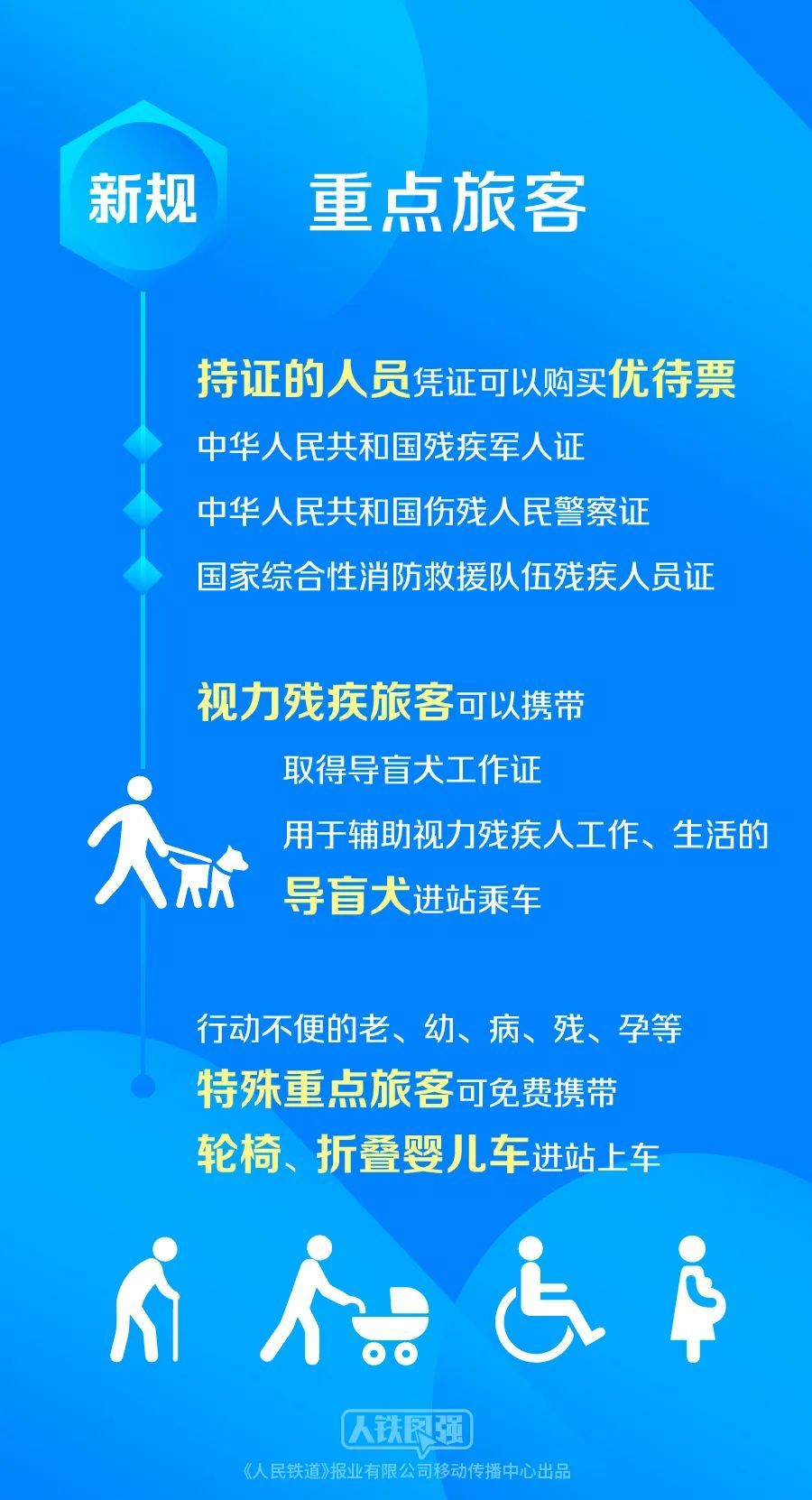 今年1月1日起实施的《中国国家铁路集团有限公司铁路旅客运输规程》中,明确了持中华人民共和国残疾军人证、中华人民共和国伤残人民警察证、国家综合性消防救援队伍残疾人员证的人员凭证可以购买优待票。明确视力残疾旅客可以携带取得导盲犬工作证,用于辅助视力残疾人工作、生活的导盲犬进站乘车。行动不便的老、幼、病、残、孕等特殊重点旅客可免费携带轮椅、折叠婴儿车进站上车,出行更加便捷。