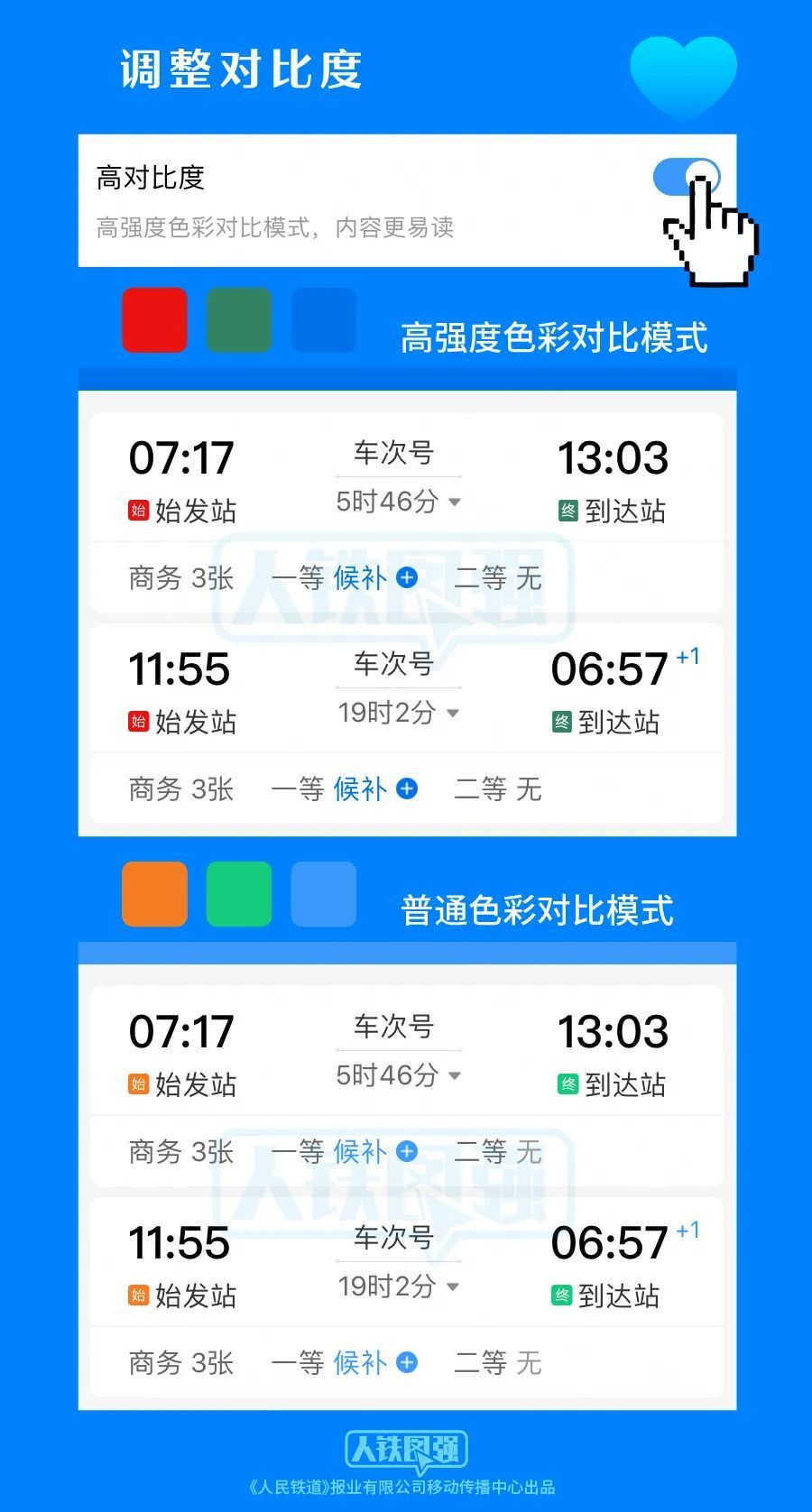 2021年9月,铁路12306APP上线了爱心版模式,对字体和排版进行适配,界面具有大字体、大图标、高对比度等特点。
