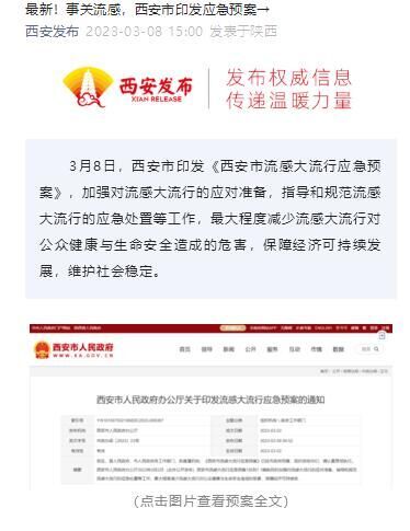 荔枝新闻讯 据“西安发布”微信号消息,3月8日,西安市印发《西安市流感大流行应急预案》,加强对流感大流行的应对准备,指导和规范流感大流行的应急处置等工作,最大程度减少流感大流行对公众健康与生命安全造成的危害,保障经济可持续发展,维护社会稳定。