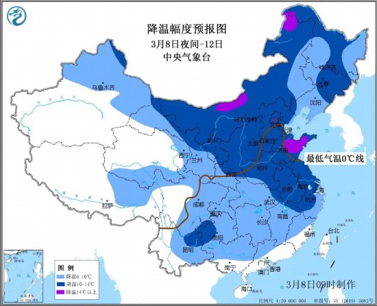 本次冷空气过程最低气温将出现在13日早晨,气温0℃线位于陕西南部、河南西部、河北南部到天津一线,山东中东部和江苏东北部等地最低气温也将降至0℃左右。