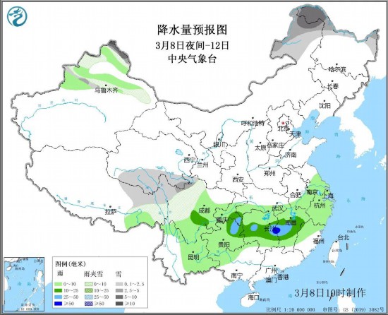 10日至12日,内蒙古东北部、黑龙江西北部等地有小到中雪,局地大雪;西南地区和江南等地有小到中雨,重庆东南部、贵州东北部、湖南中部和江西中部等地有大雨,局地有暴雨(累计降雨量50~80毫米),主要降雨时段出现在10日夜间至11日。