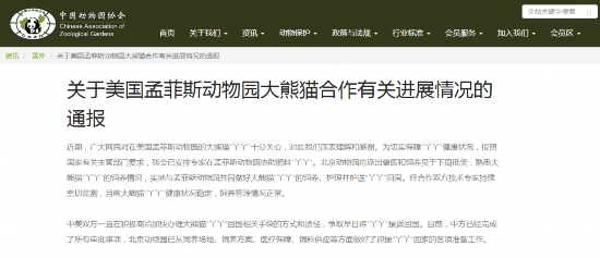 中国动物园协会官网 发布关于美国孟菲斯动物园大熊猫合作有关进展情况的通报: