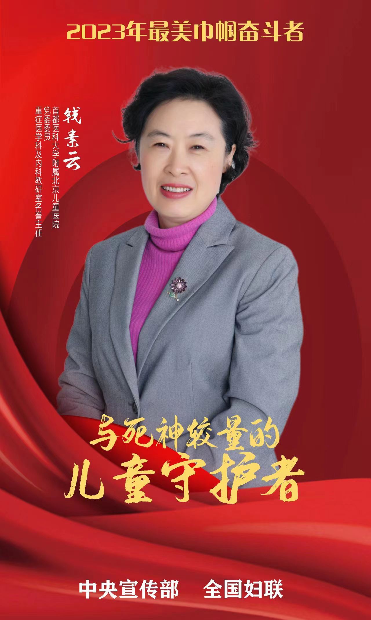 钱素云、陈雨佳、宋寅、孙金娣、王霜、杨浪浪、石丽平、宋晓玲、武桂珍、徐崇彦10位全国三八红旗手标兵光荣入选2023年“最美巾帼奋斗者”。她们坚持以习近平新时代中国特色社会主义思想为指导,对党忠诚、信念坚定,自信自强、敬业奉献,有的以精湛的医术守护人民健康,有的在高水平科技前沿阵地勇攀高峰,有的投身乡村振兴带领村民增收致富,有的站在三尺讲台为党育人为国育才,有的扎根基层用心用情用力服务群众,有的为建设海洋强国贡献青春力量,有的作为中国女足“领头雁”为国争光……她们始终坚持人民至上,厚植为民情怀,用坚定信仰诠释初心,用实际行动担当使命,谱写了“巾帼心向党 奋进新征程”的壮丽华章。