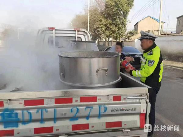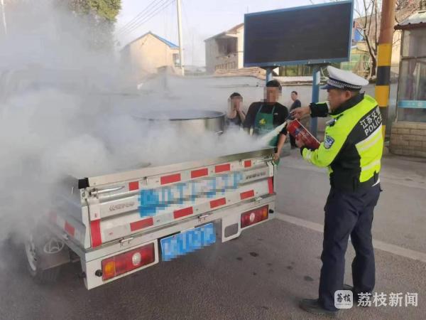 昨天(3月7日)14时50分,一辆号牌为鲁D号牌的蓝牌轻型货车,在行驶至徐州市贾汪区江庄公安检查站时,货厢内冒出的浓烟,引起了正在值勤的民警的注意,伴随着浓烟,火势逐渐扩大,可驾驶人却没有发现后面货车厢已经起火。民警立即上前将该车拦停,并对火势进行扑救。