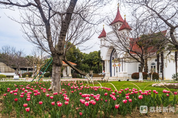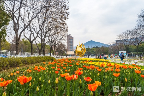在南京玄武湖的情侣园内,郁金香已经初绽,花色艳丽,给春日大地披上了一袭华丽的彩衣。