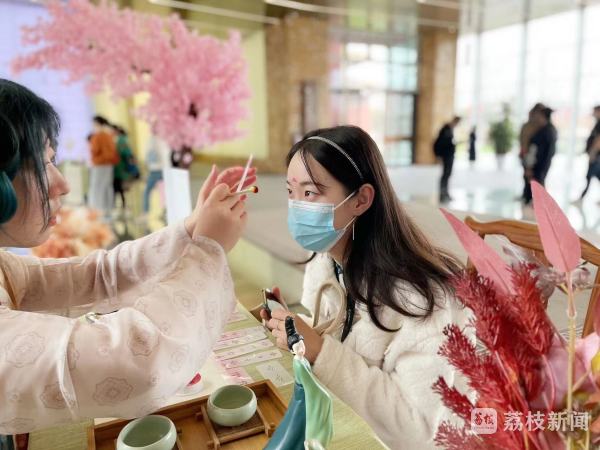 花钿又称“面花”,是贴在眉间或面颊上的花形装饰,深受中国古代女性的青睐。大报恩寺遗址景区将这一传统装饰形式,进行创新升级,定制了极具春意的梅花、桃花等花钿样式。眉间颜色轻染,朵朵春花盎然,既有当下的春天气息,又能体验古代妆容的灵动柔美。游客们纷纷表示,妇女节这天,在文化地标大报恩寺遗址上,装点一颗自己喜欢的花钿,是一份具有厚重文化内涵的特殊礼物。