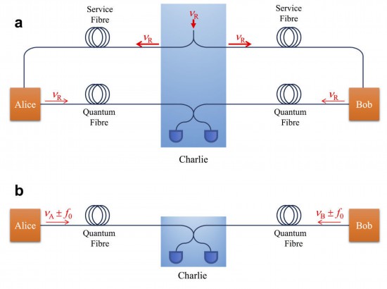 北京量子信息科学研究院首席科学家袁之良介绍,双场架构下量子通信,需要相距遥远的两个独立激光源各自发出“信号”。如果激光源发射的“信号”频率不同,就会出现传输中的“信号”失误。想要避免“信号”失误,就需要一个能实现两端“信号”频率相同的“工具”:服务光纤。这意味着通信两端之间还需额外架设“一条路”,这也就构成了由“两条路”构成的传统架构。