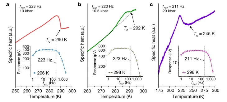 Dias还对比热进行了测量,结果如上图所示,这里给出了10、10.5、20kbar的测量结果,可以看到,三个比热的曲线均能看到超导在比热上的转变,Tc与电阻的测量结果略有区别但完全可以理解,这个结果是合理的。不过该说不说,这个比热的转变并不算明显,尤其是10.5kbar的曲线,峰并不明显,10kbar的转变也尚不如20kbar明显。这三个比热的转变看起来也有些区别,尤其是10kbar和10.5kbar的数据,仅差了0.5kbar,但图像差异却很大。不过考虑是高压下测量的,或许有一些我们不知道的困难吧。