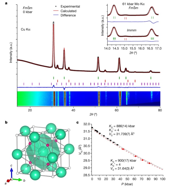 b图则是他们绘制的晶胞图,白色原子是氢,绿色的是镥,粉色的是不同位点的氢原子,他们给出的样品化学式是LuH3−δNε,61kbar时空间群是Fm-3m和Immm,但Dias认为超导相空间群是前者。