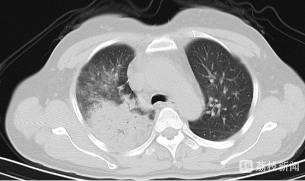 孙女士身体一直很好,突然出现出现畏寒寒战,当时未测体温,伴四肢乏力,走路不稳,测体温为39.9℃,乏力症状较前加重,且有言语混乱。家属将她送到当地医院进行治疗,效果不佳,仍有高热、言语错乱,家属焦急万分,将她送到南京市第一医院呼吸内科进行治疗。入院后,医生予布洛芬退热、抗感染治疗后,孙女士体温可下降,但数小时后体温再次上升。孙女士被转入呼吸内科重症病房进行治疗。入室时,患者表情淡漠,呼吸频快,血气分析示I型呼吸衰竭,氧合指数仅200mmHg。胸部CT可见右肺多肺叶浸润,诊断为重症肺炎。