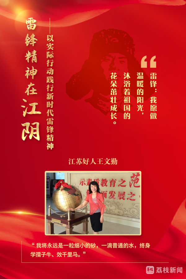 王文勤,女,1957年生,原江阴市新桥中心小学副校长。她没有惊天动地的丰功伟绩,没有可歌可泣的动人事迹,但她在平凡的工作岗位上做出了不平凡的贡献。从教30多年来,无论是对待教师,还是对待学生,她始终践行着“爱满天下”的格言,把爱洒向一代又一代学子,用爱诠释新时代教师的雷锋精神。