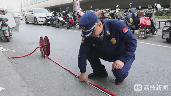 执法人员现场抽查消防软管,执法人员表示按照消防产品的一个判定标准,实际测量的长度和软管卷盘所标误差必须在1米之内,执法人员随机抽查一卷软管,实际测量长度是22.6米23米不到,根据相关规定,误差长度超过1米属于不合格的产品。