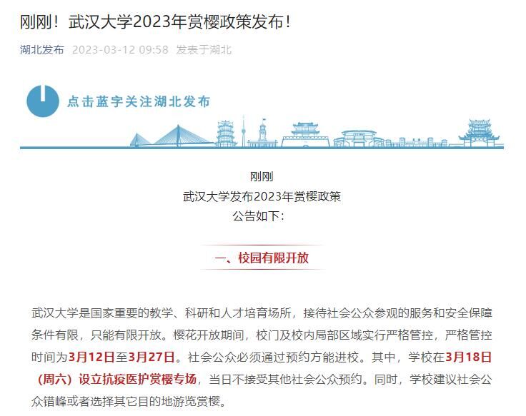 荔枝新闻讯 3月12日,据湖北发布微信公众号消息,刚刚,武汉大学发布2023年赏樱政策。公告如下: