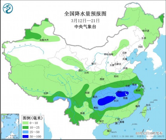 预计未来十天(3月12-21日),西南地区、江南部分地区累计降水量有25~40毫米,部分地区有50~70毫米,上述地区接近常年或偏多4~8成。其他大部地区降水仍偏少或没有降水。
