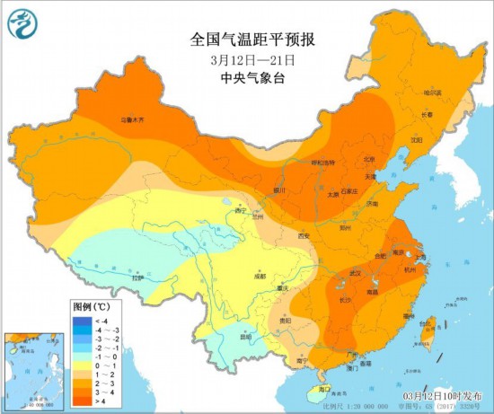 过去十天(3月2日-11日),我国除了青藏高原、云南、福建等地气温接近常年外,我国其他大部地区气温较常年同期显著偏高4~6℃,其中新疆北部、华北北部、黄淮和东北地区的部分地区偏高8℃左右,多地气温突破历史同期极值。
