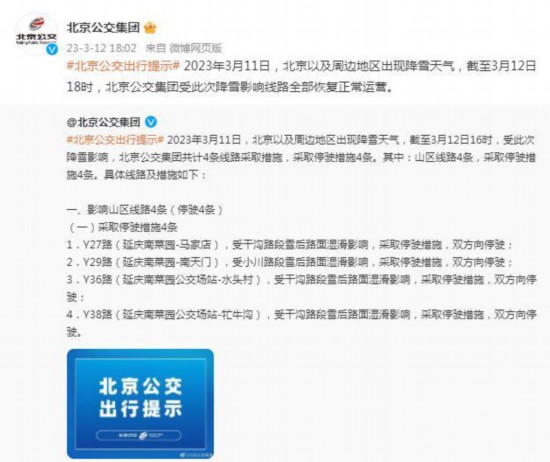 荔枝新闻讯 据北京公交集团微博消息,2023年3月11日,北京以及周边地区出现降雪天气,截至3月12日18时,北京公交集团受此次降雪影响线路全部恢复正常运营。