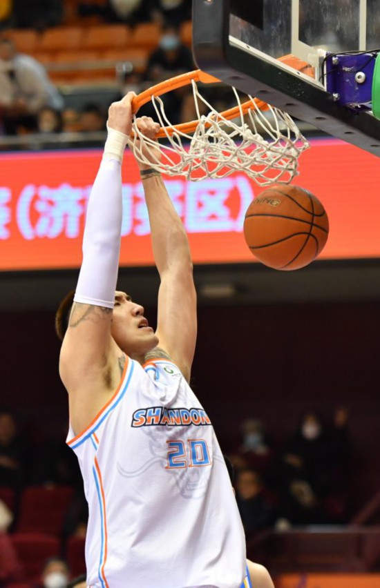 3月12日,山东队球员陶汉林在比赛中扣篮。新华社记者徐速绘摄
