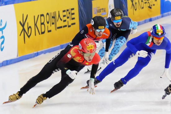 3月11日,中国选手林孝埈(左前)在男子500米A组决赛中。新华社记者 王益亮 摄