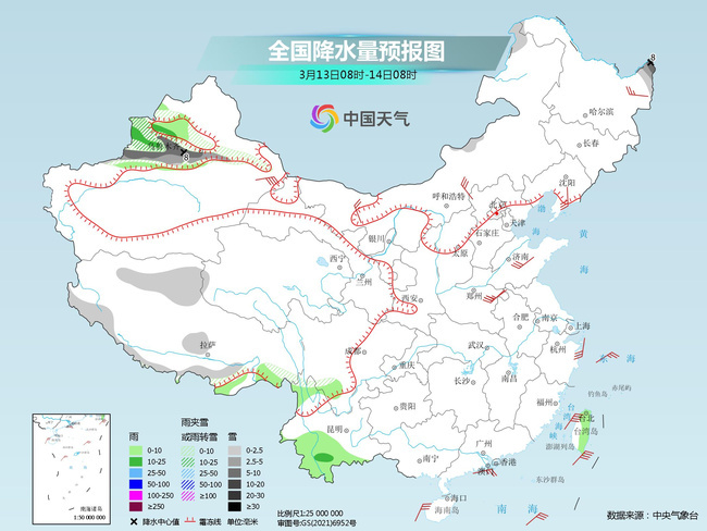 今天,南方降水趋于结束,东北地区降雪明显缩减,新疆雨雪增多。中央气象台预计,新疆沿天山地区、西藏北部和南部、黑龙江东北部等地部分地区有小到中雪或雨夹雪,其中,新疆沿天山地区、黑龙江东北部等地部分地区有大雪(5~8毫米);新疆天山北麓和伊犁河谷、西藏东南部、川西高原南部、云南中南部等地部分地区有小雨,局部中雨。
