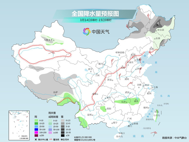 明天,东北降水再度增多、增强,预计,新疆沿天山地区、西藏大部、青海西南部、内蒙古东部、黑龙江、吉林大部、辽宁东北部等地部分地区有小到中雪或雨夹雪,其中,黑龙江中部、吉林东部等地部分地区有大雪(5~6毫米);西藏东南部、湖南北部、江西北部、贵州西部、云南西南部等地部分地区有小雨。