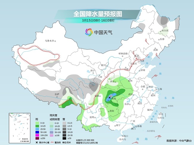 后天,西藏南部和东部、青海南部、甘肃东部、川西高原北部、陕西南部、黑龙江中部和北部等地部分地区有小到中雪或雨夹雪;西藏东南部、西北地区东南部、黄淮西部、江汉大部、湖南西部、西南地区东部、云南西南部等地部分地区有小到中雨,其中,四川盆地东北部、重庆西部和北部等地部分地区有大雨(25~40毫米)。