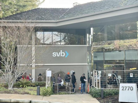 位于加州的硅谷银行总部13日早上7点就开始出现排队人潮,尽管可以使用网络银行操作,不少客户仍选择柜台作业。银行大门一开,一次仅开放一组客户入内办理银行业务,可领银行支票、现金,或汇款至其他银行账户。