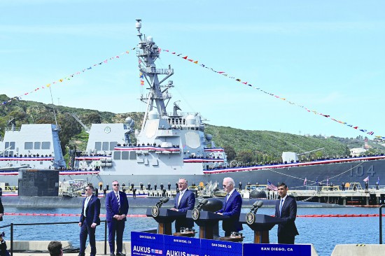 美国总统拜登13日在加州圣迭戈美国海军基地,与英国首相苏纳克以及澳大利亚总理阿尔巴尼斯就美英澳“奥库斯”三边安全伙伴关系举行会谈,并公布为澳大利亚配备核潜艇的计划细节。这意味着澳大利亚将成为全球第七个拥有核潜艇的国家。澳国内舆论质疑核潜艇计划在主权、成本、核不扩散问题上存在巨大风险。东南亚国家也批评该计划可能引发军备竞赛,影响地区和平与安全。中国外交部发言人汪文斌14日表示,美英澳发表的最新联合声明表明,三国为了一己地缘政治私利,完全无视国际社会关切,在错误和危险道路上越走越远。专家认为,澳大利亚这是成了“冤大头”,花本国的钱为美国的“印太战略”服务,堪称“史无前例”。此外,美国国防部13日公布创纪录的8420亿美元国防预算细节,再拿“中国威胁”说事。中方多次表明,美方所谓的“应对中国挑战”包藏着谋求无限霸权和绝对安全、遏制中国的祸心。