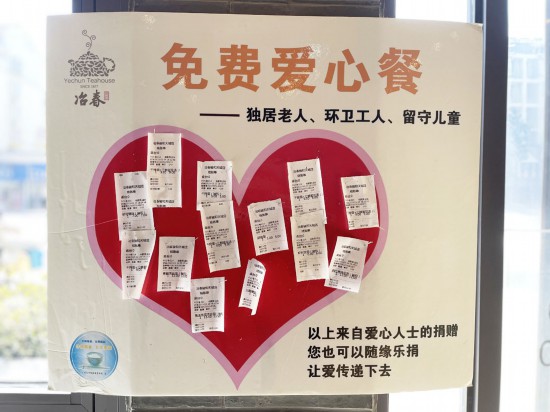 这块“爱心牌”写有“免费爱心餐——独居老人、环卫工人、留守儿童”的温馨提示;中间贴着一张张提前买过单的餐品订单,“干拌面+蛋花汤”“鱼汤雪菜肉丝面”“青椒面”“馄饨”等十多个品种,困难群体只要按需揭单就能饱餐一顿。下方还有一段备注,上面写着“以上来自爱心人士捐赠,您也可以随缘乐捐,让爱传递下去。”