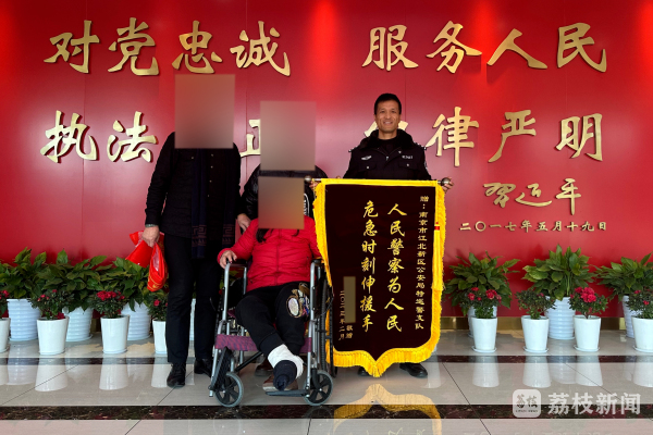 “终于找到你们了,我就是想感谢一下背我的那个小伙子。”昨天(3月14日),市民汪女士将一面印有“人民警察为人民危机时刻伸援手”的锦旗送到南京市公安局江北新区分局特巡警支队二大队,感谢一个月前辅警队员对其的帮助。