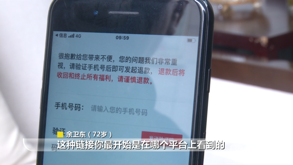 余卫东说:“都是在链接里面搞出来看到的,视频号里头,直播里的也有、我主要就是没得事看新闻就在这些地方看,然后有时候就会跳出来一些东西,就点到了。”突然,余叔叔的电话响了,接听后是保健品推销电话。“专门卖保健品,个电话全国各地都有,天天打来的,我不会相信,一般都关了。”