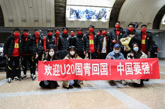 2023年3月16日,北京,中国U20男足结束亚洲杯征程返回北京,球迷拉横幅与球员合影。 视觉中国 图