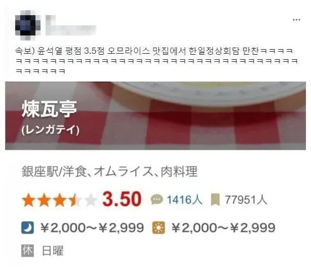 日媒透露,尹锡悦告诉日方,以前访问东京之际,曾在这家西餐馆吃过蛋包饭,令人难忘。为此,岸田考虑通过在西餐馆罕见安排“二次会”,让尹锡悦重温“留下回忆的味道”,建立信赖关系。