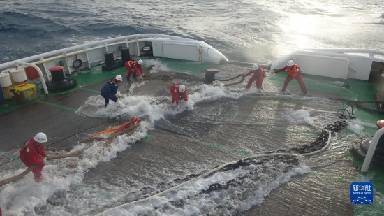 “南海救115”抵达受困货船附近,水手长卢大明(右)带领水手们施救(3月4日摄)。新华社发(交通运输部南海救助局供图)
