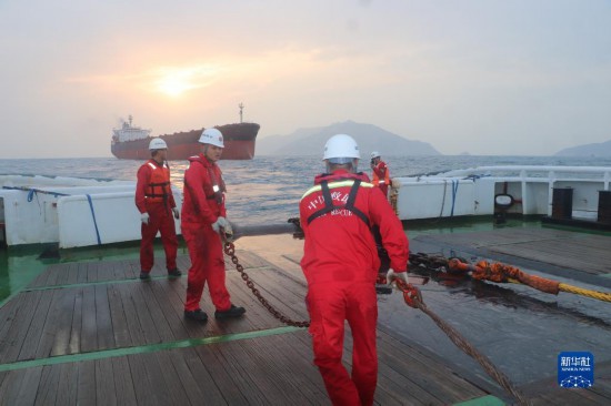 历经10日的海上拖带,“南海救115”船成功将受困货船拖救至广东珠江口水域(3月13日摄)。新华社发(交通运输部南海救助局供图)