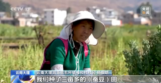 云南大理洱源县右所镇梅和村村民 杨银培:我们种了三亩多的蚕豆田,蚕豆是生态种植。我们把豆摘了,蚕豆秆用来喂牛。