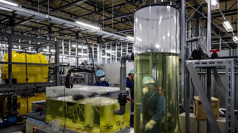 工作人员在东京电力公司(TEPCO)福岛第一核电站的海洋生物饲养试验设施中工作。图片来源:欧洲新闻网