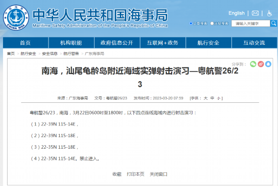 南海,汕尾龟龄岛附近海域实弹射击演习—粤航警26/23