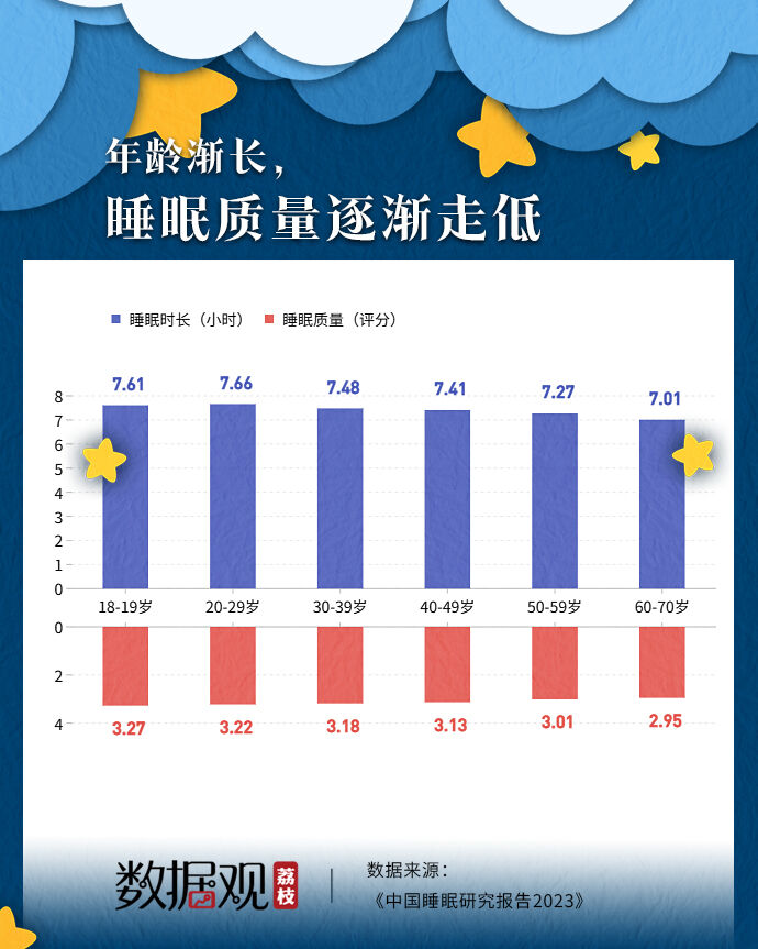 《中国睡眠研究报告2023》显示,越年轻的人睡得越好。随着年纪增长,睡眠时长呈缩短趋势,自身对睡眠质量的评分也在下滑,60岁以上受访者的自评最低。