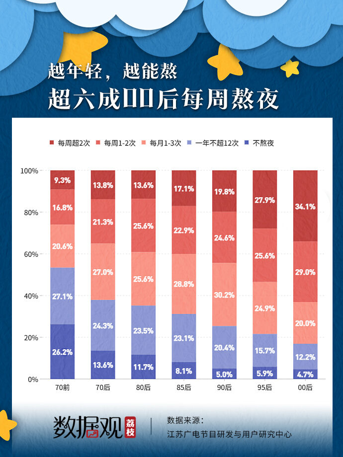 谈到熬夜,90.5%的受访者表示近一年来有熬夜经历,每月甚至每周都会熬一熬的比例达到70%。
