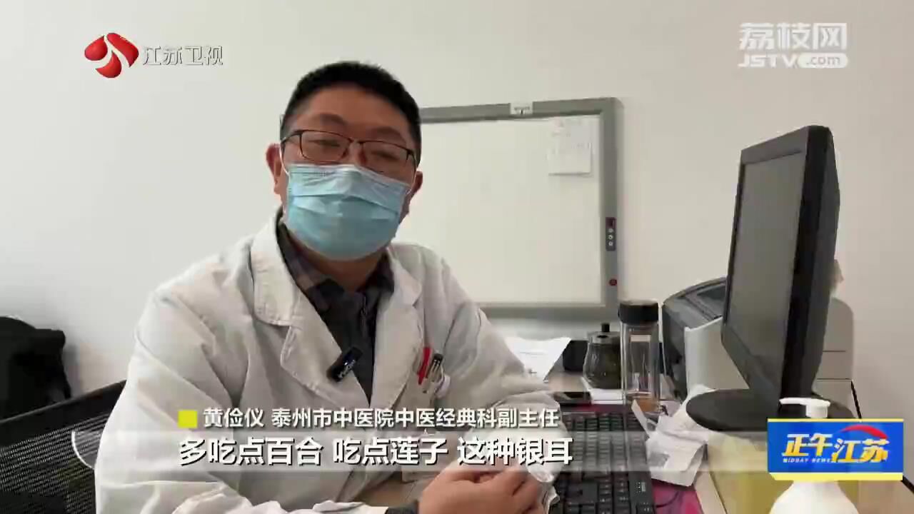 泰州市中医院中医经典科副主任黄俭仪说:“多吃点百合、吃点莲子、银耳,防止火旺了之后熏灼我们的肺经,要多吃绿色之草蔬,缓解我们的火旺。”