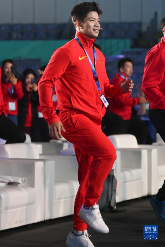 当日,男子100米亚洲纪录保持者苏炳添在杭州奥林匹克体育中心出席“5G亚运之队”启动发布会。