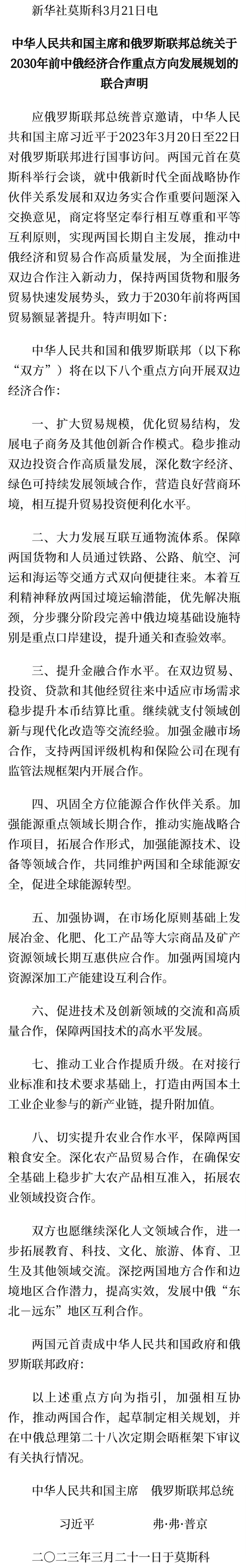 中华人民共和国主席和俄罗斯联邦总统关于2030年前中俄经济合作重点方向发展规划的联合声明